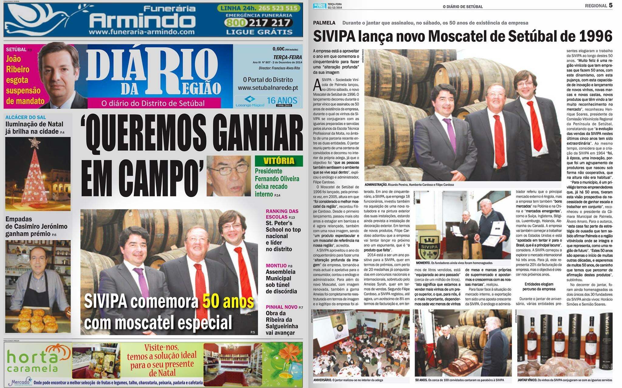 Sivipa celebrated its fiftieth anniversary in Palmela, with a dinner served in the cellar, Saturday 29 November 2014. Among the guests were the Mayor of Palmela and the President of the Setúbal Peninsula Wine Region CVR that highlighted the contribution of this producer to the region. The event made the cover of Diário da Região newspaper.